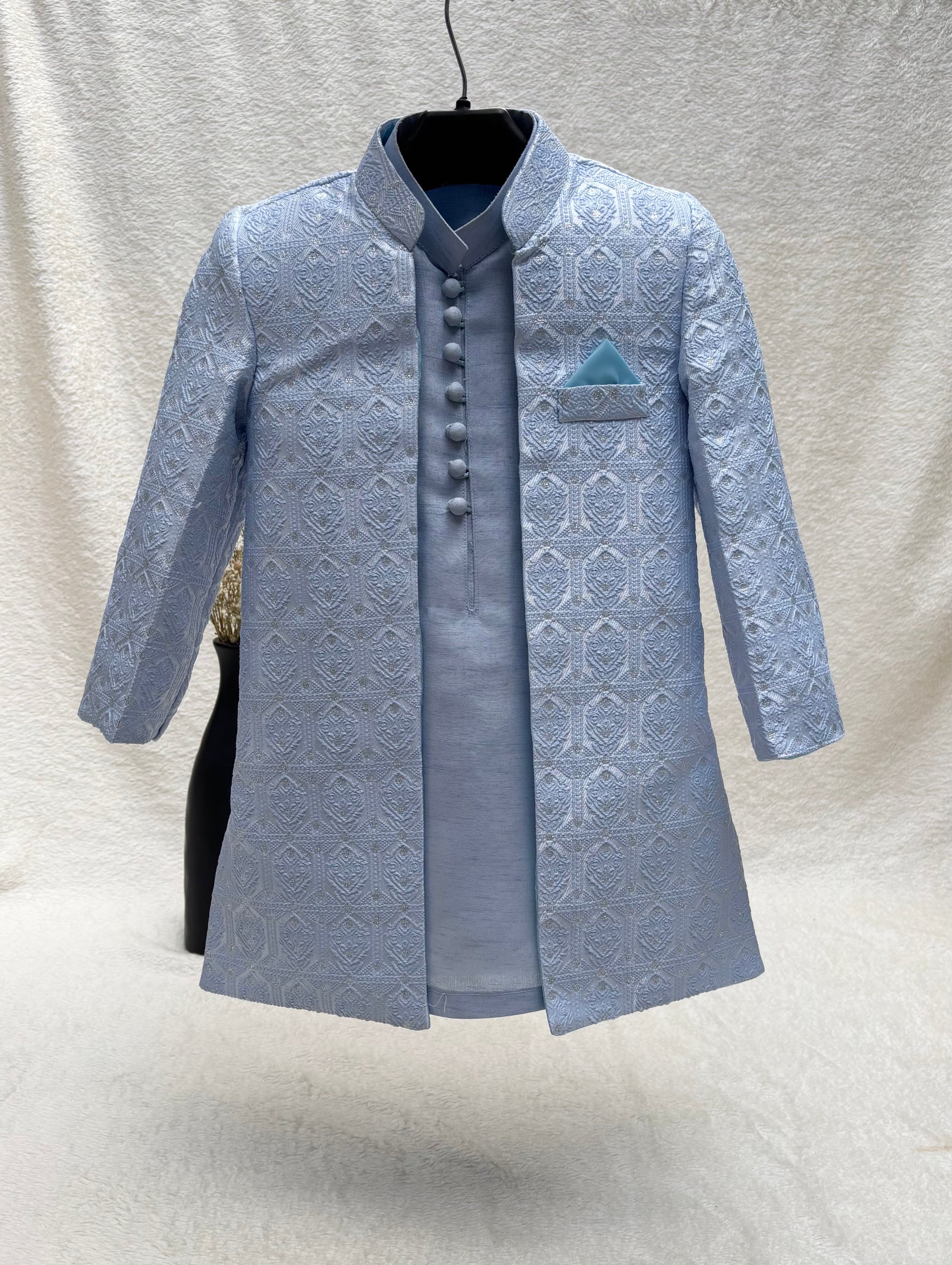 Blue Self Textured Front Open sherwani paired with a matching raw silk kurta pajama. The perfect outfit for all festive occasions by Eastern Buds.