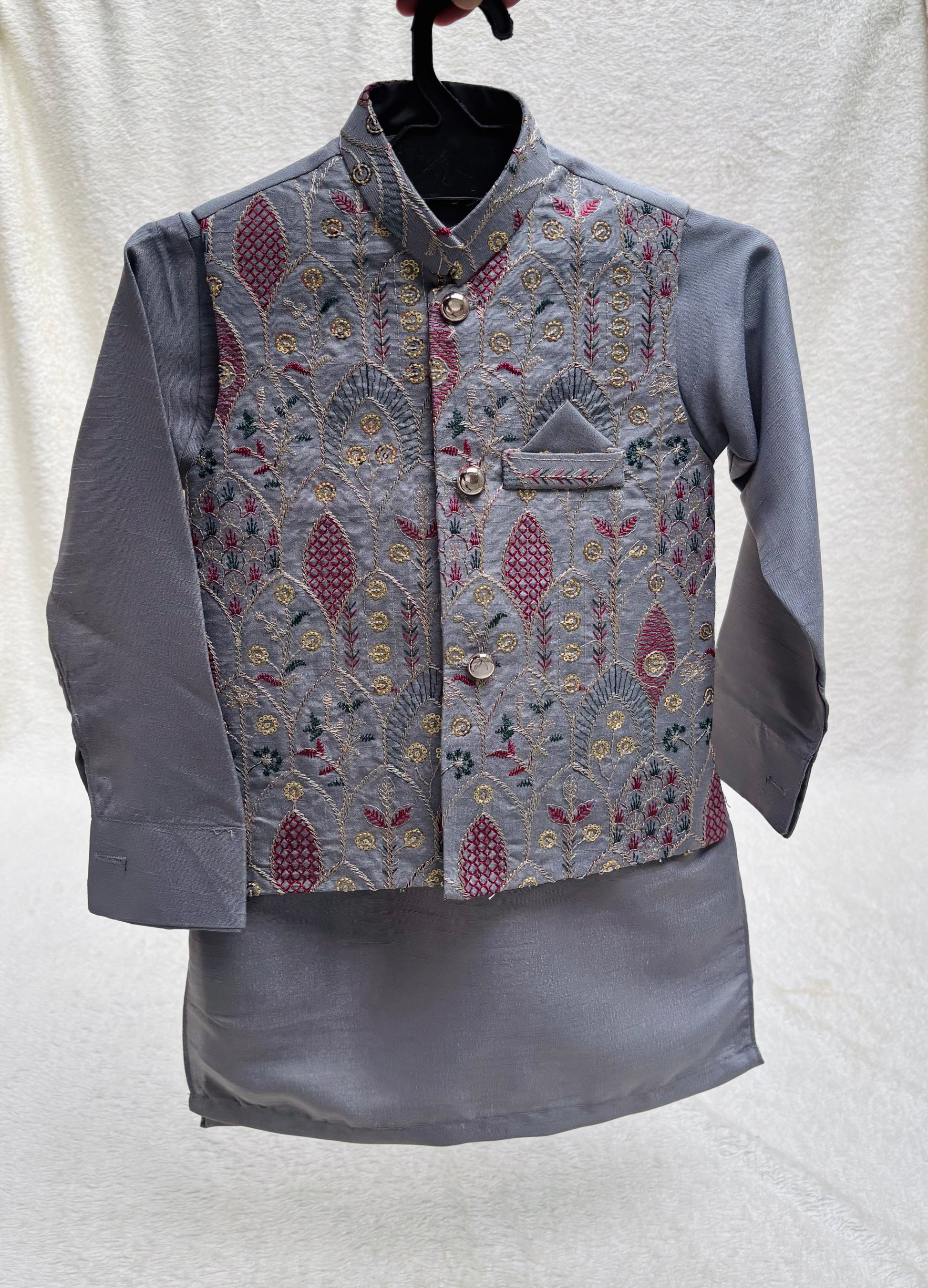 Gray Embroidered waistcoat paired with matching soft rawsilk kurta pajama. Perfect for all festive and special occasions by Eastern Buds.