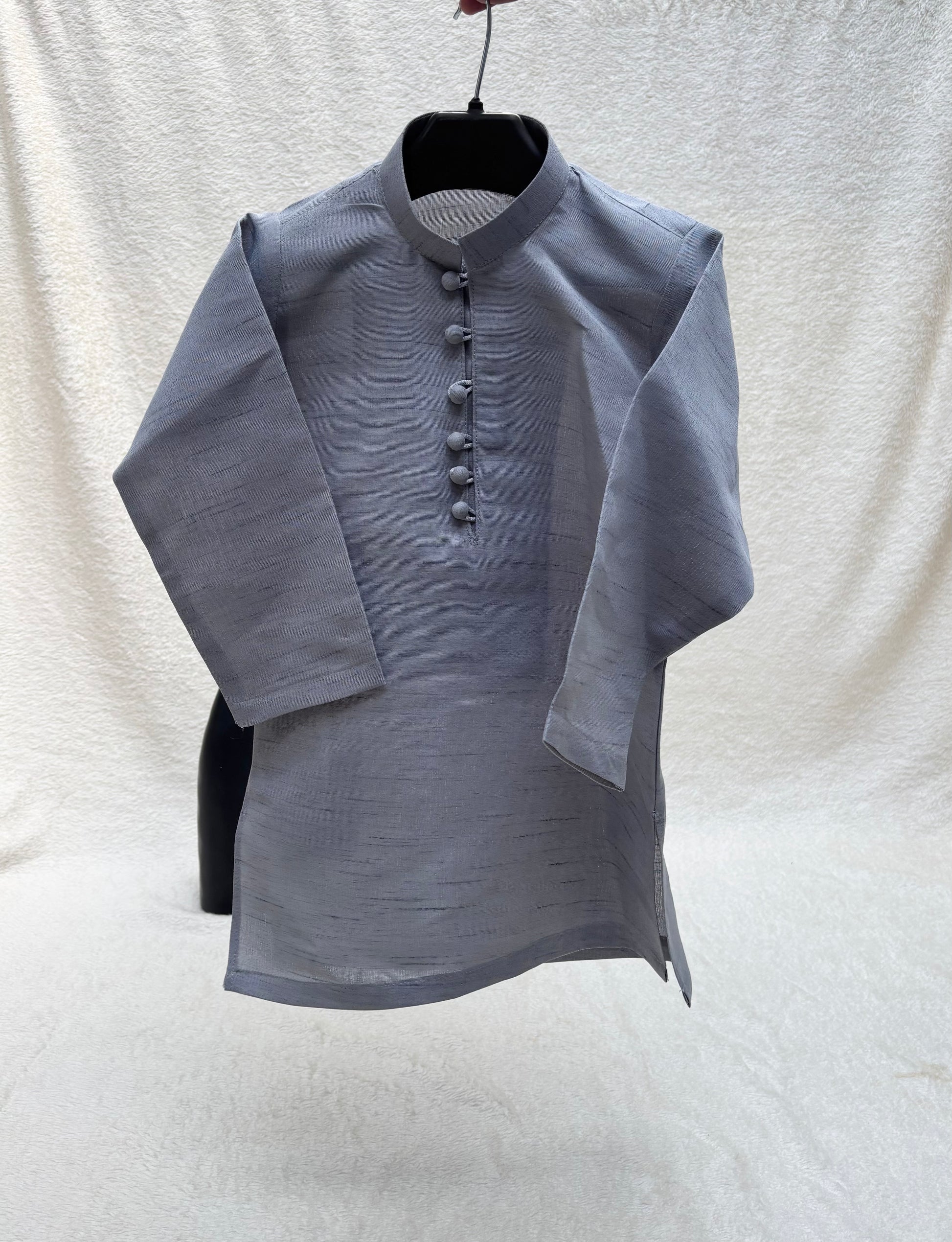 Gray Self Textured Front Open sherwani paired with a matching raw silk kurta pajama. The perfect outfit for all festive occasions by Eastern Buds.