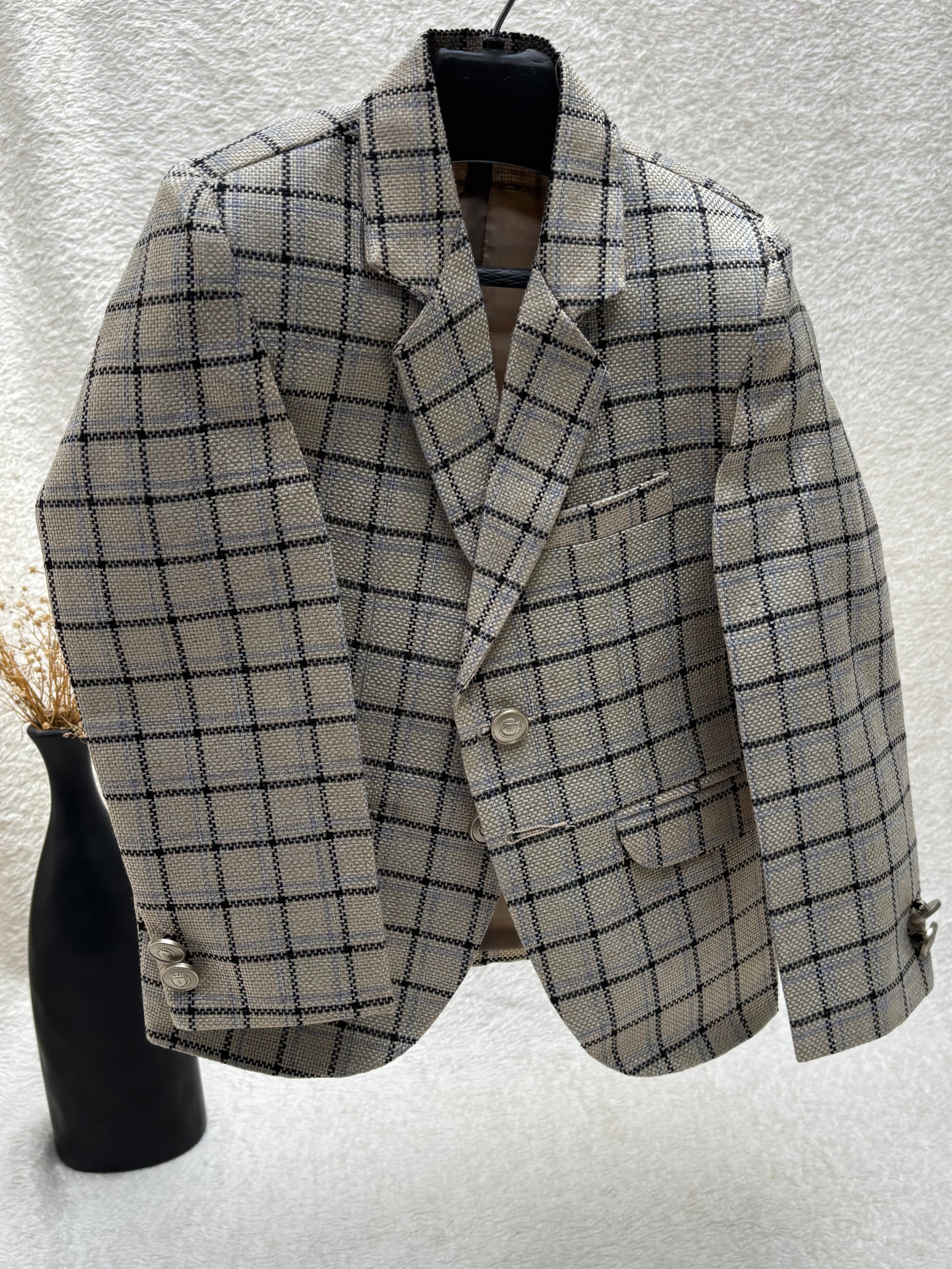Jute Beige Checkered Blazer for your little hero, stylish and versatile! Pair it with a shirt and pants or a kurta pajama for a dashing look. Perfect for all special occasions!