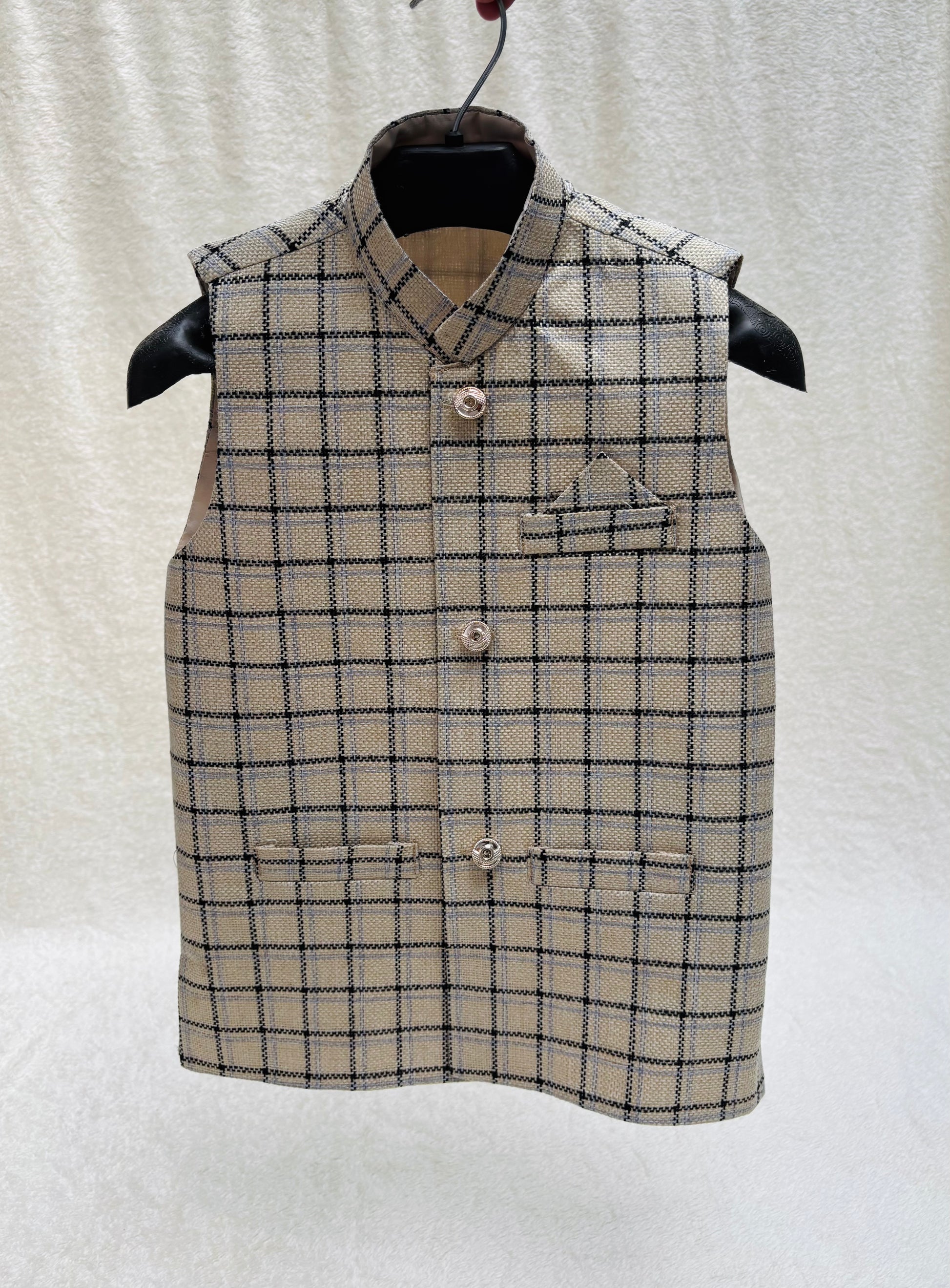 Jute Beige Checkered waistcoat for your little one by Eastern Buds, crafted for a regal ethnic look! Perfectly pairs with a kurta pajama, making it ideal for weddings, festives, and special occasions.