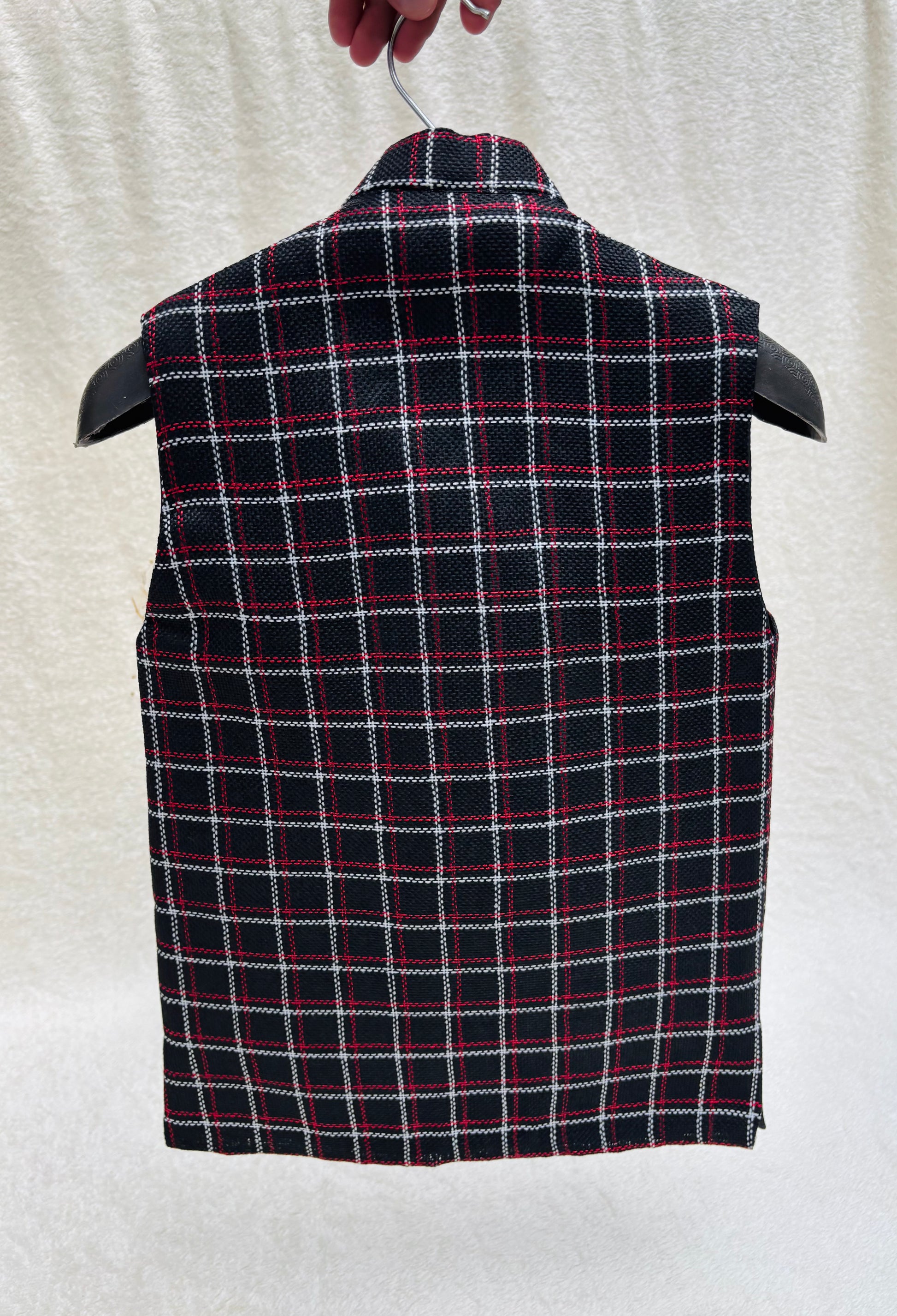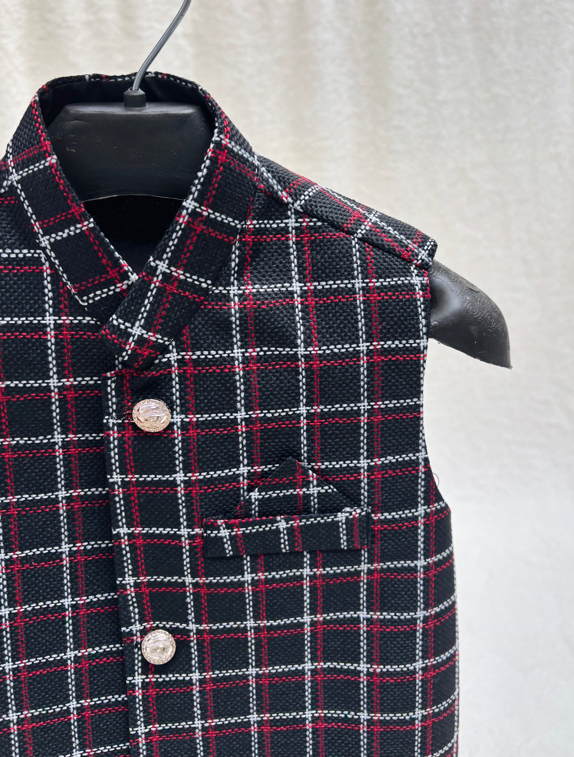Jute Black Checkered waistcoat for your little one by Eastern Buds, crafted for a regal ethnic look! Perfectly pairs with a kurta pajama, making it ideal for weddings, festives, and special occasions.