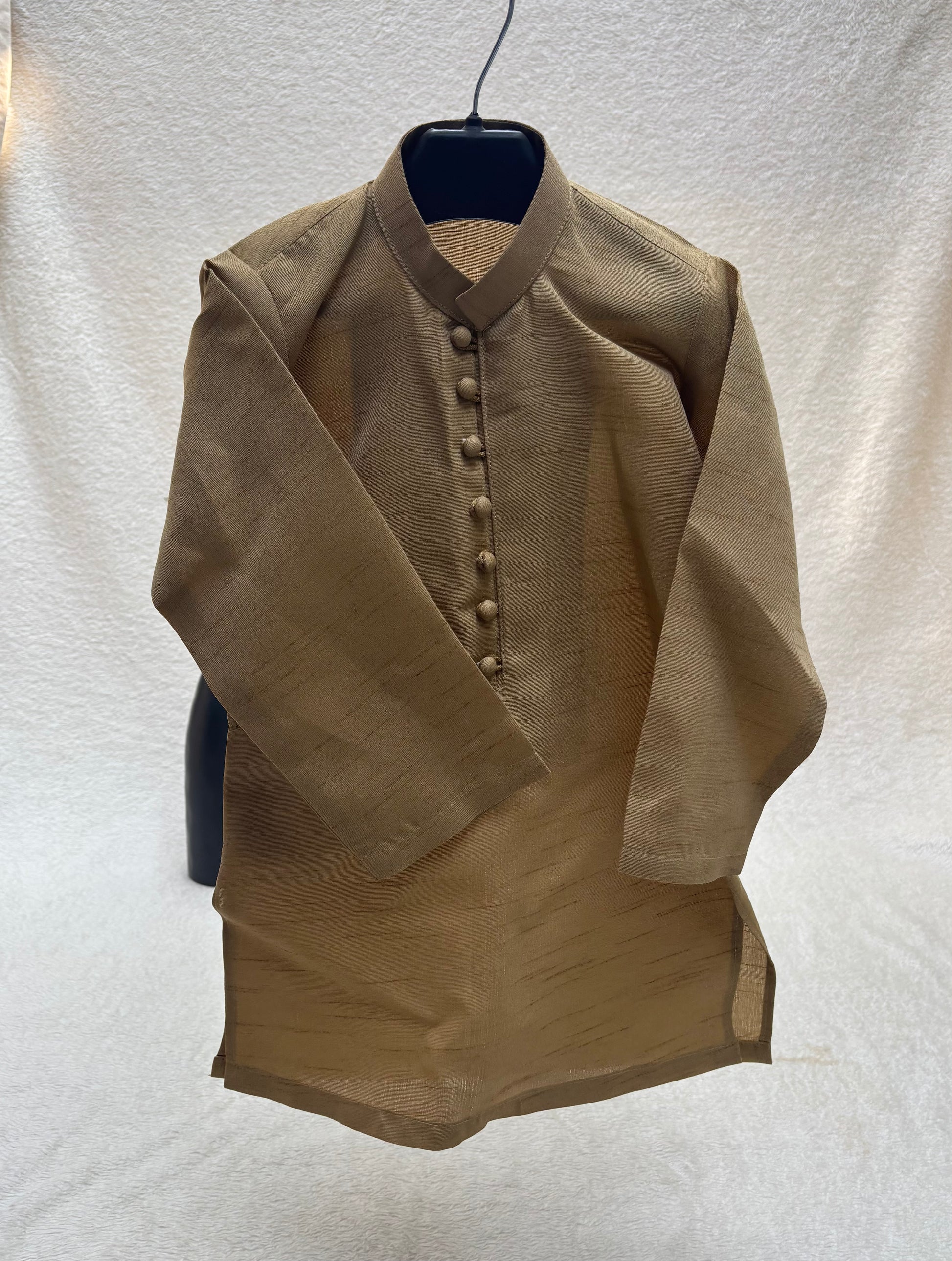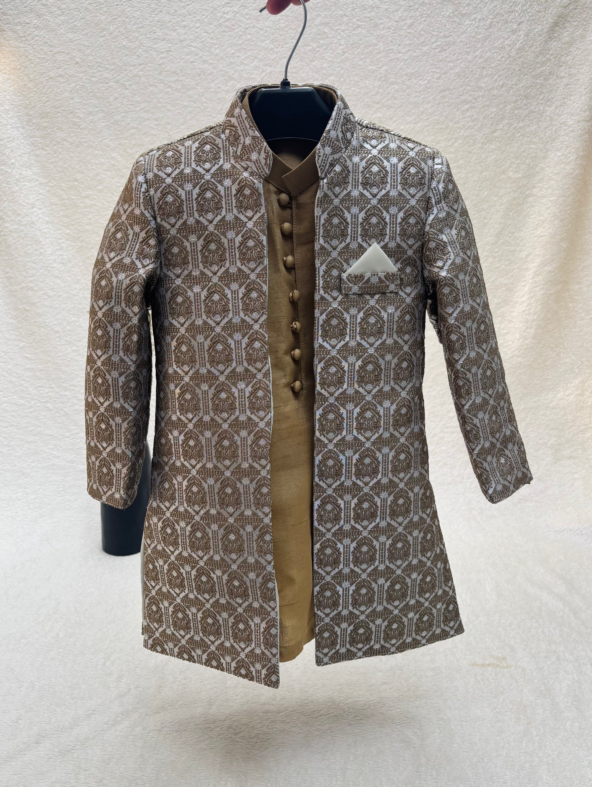 Mehandi Self Textured Front Open sherwani paired with a matching raw silk kurta pajama. The perfect outfit for all festive occasions by Eastern Buds.