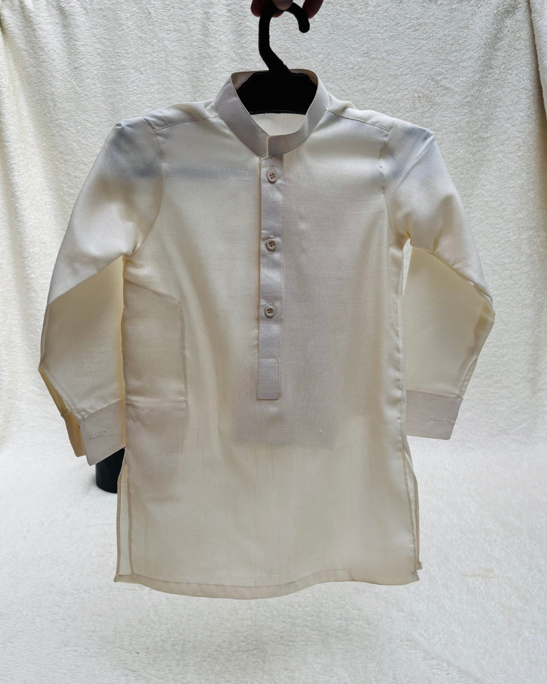 Off-White Embroidered waistcoat paired with matching soft rawsilk kurta pajama. Perfect for all festive and special occasions by Eastern Buds.