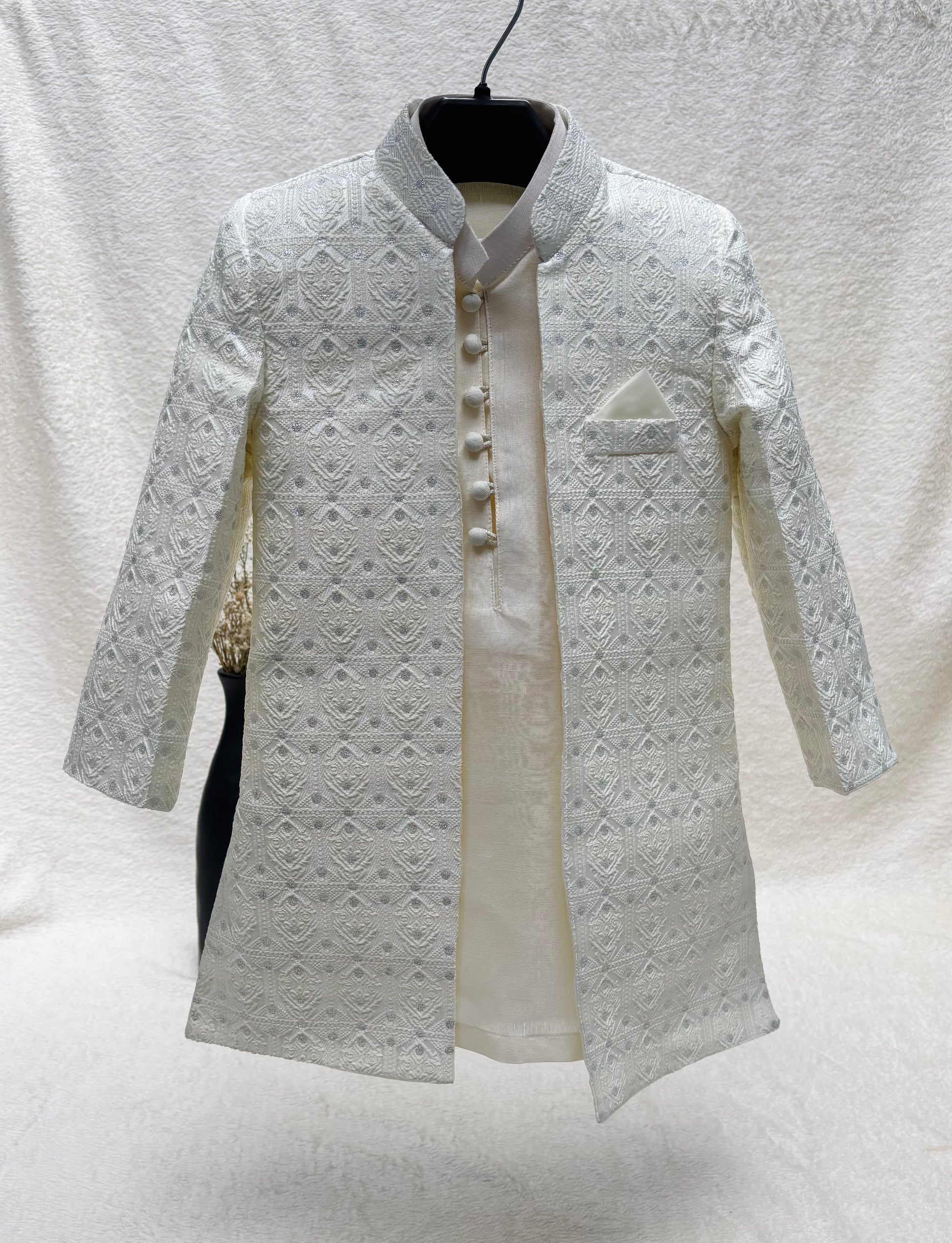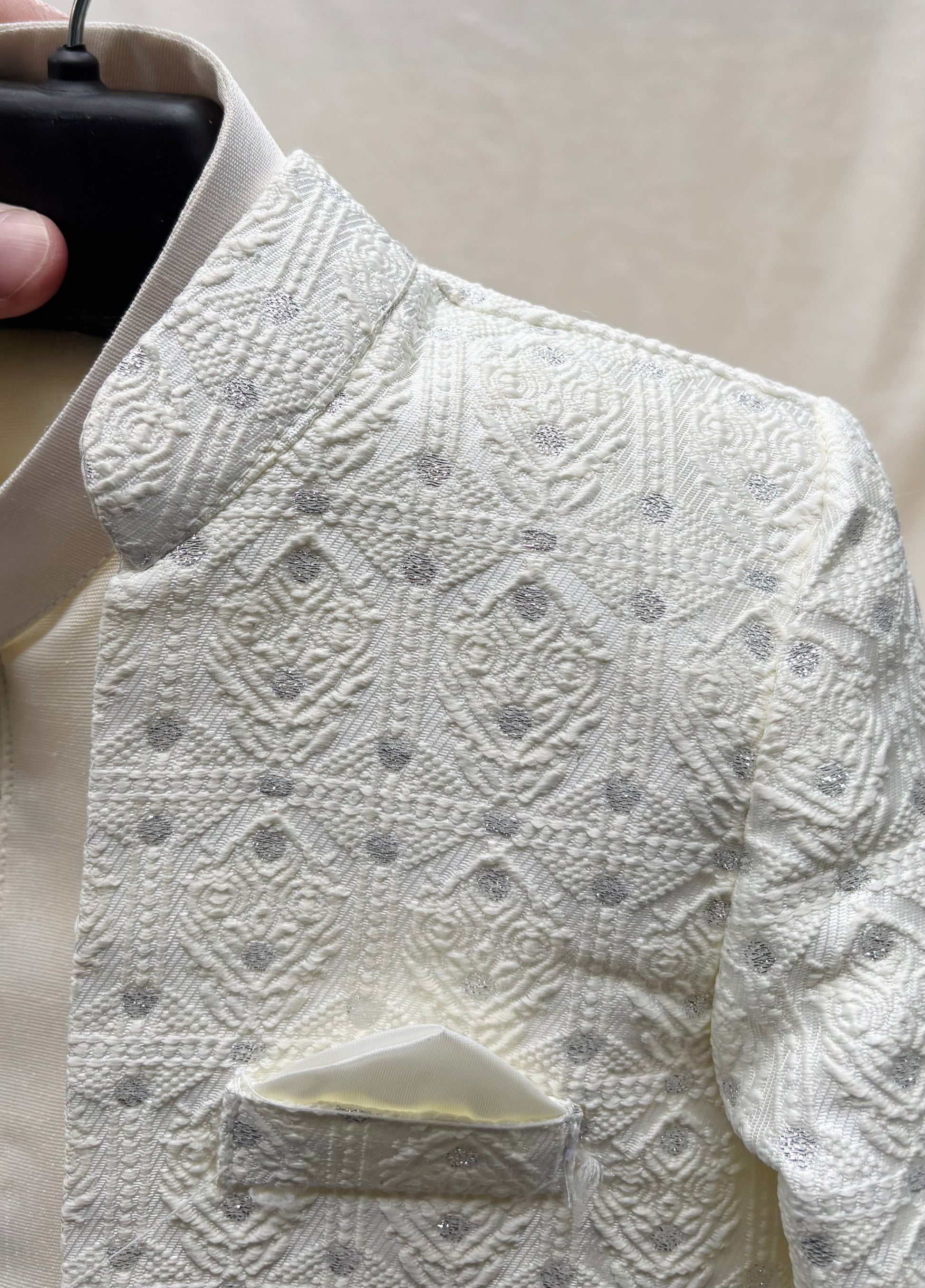 Off-White Self Textured Front Open sherwani paired with a matching raw silk kurta pajama. The perfect outfit for all festive occasions by Eastern Buds.