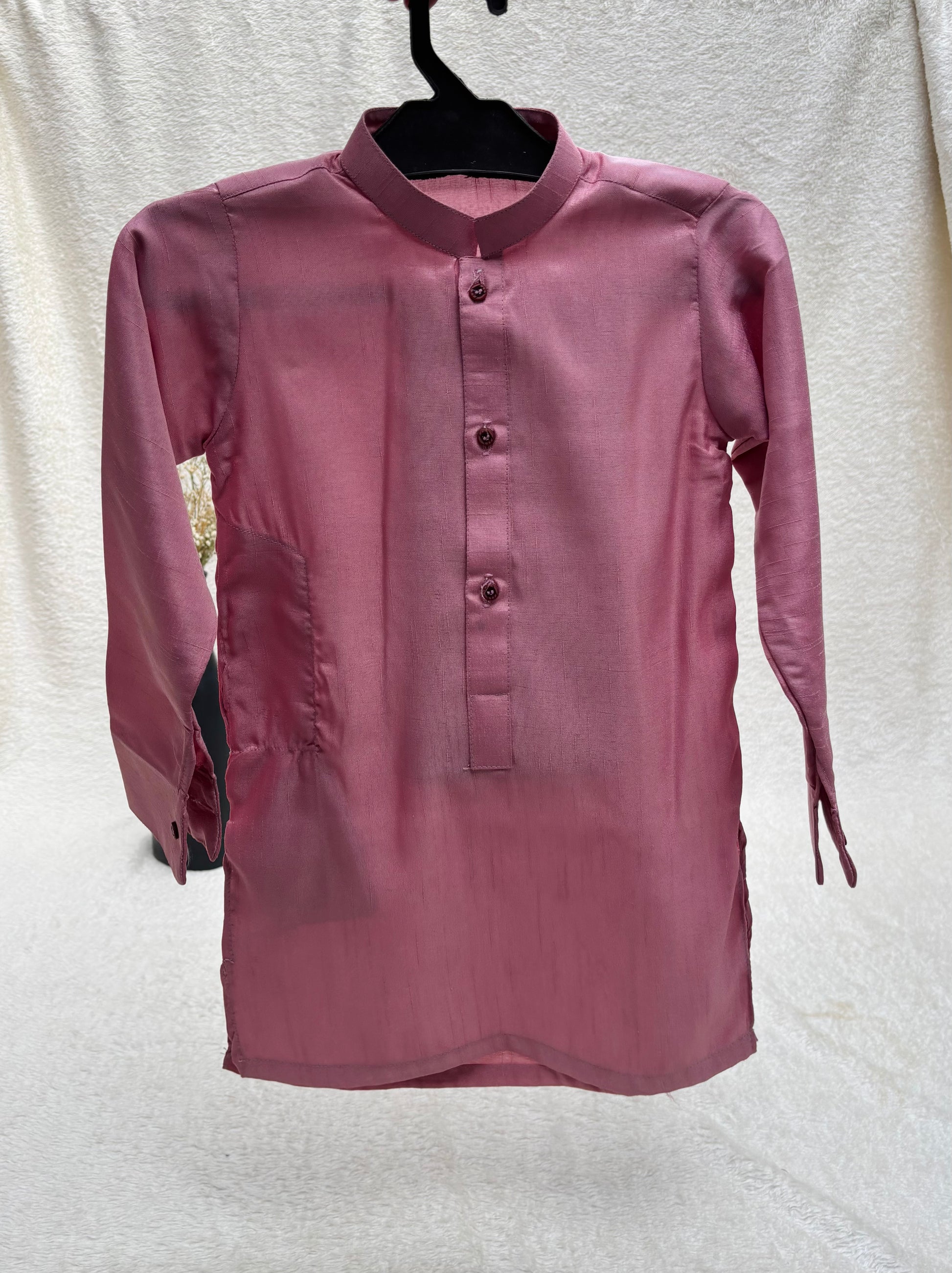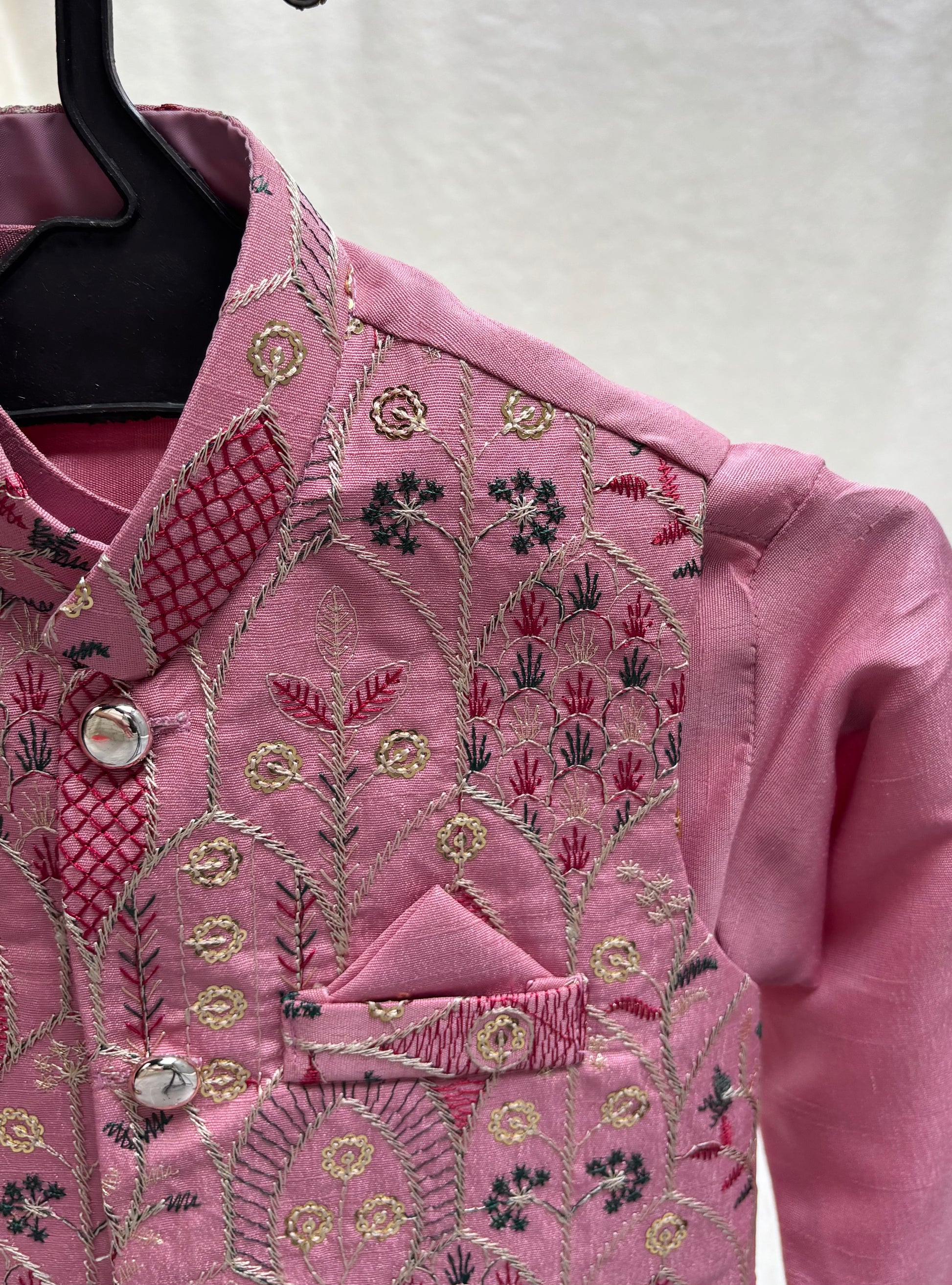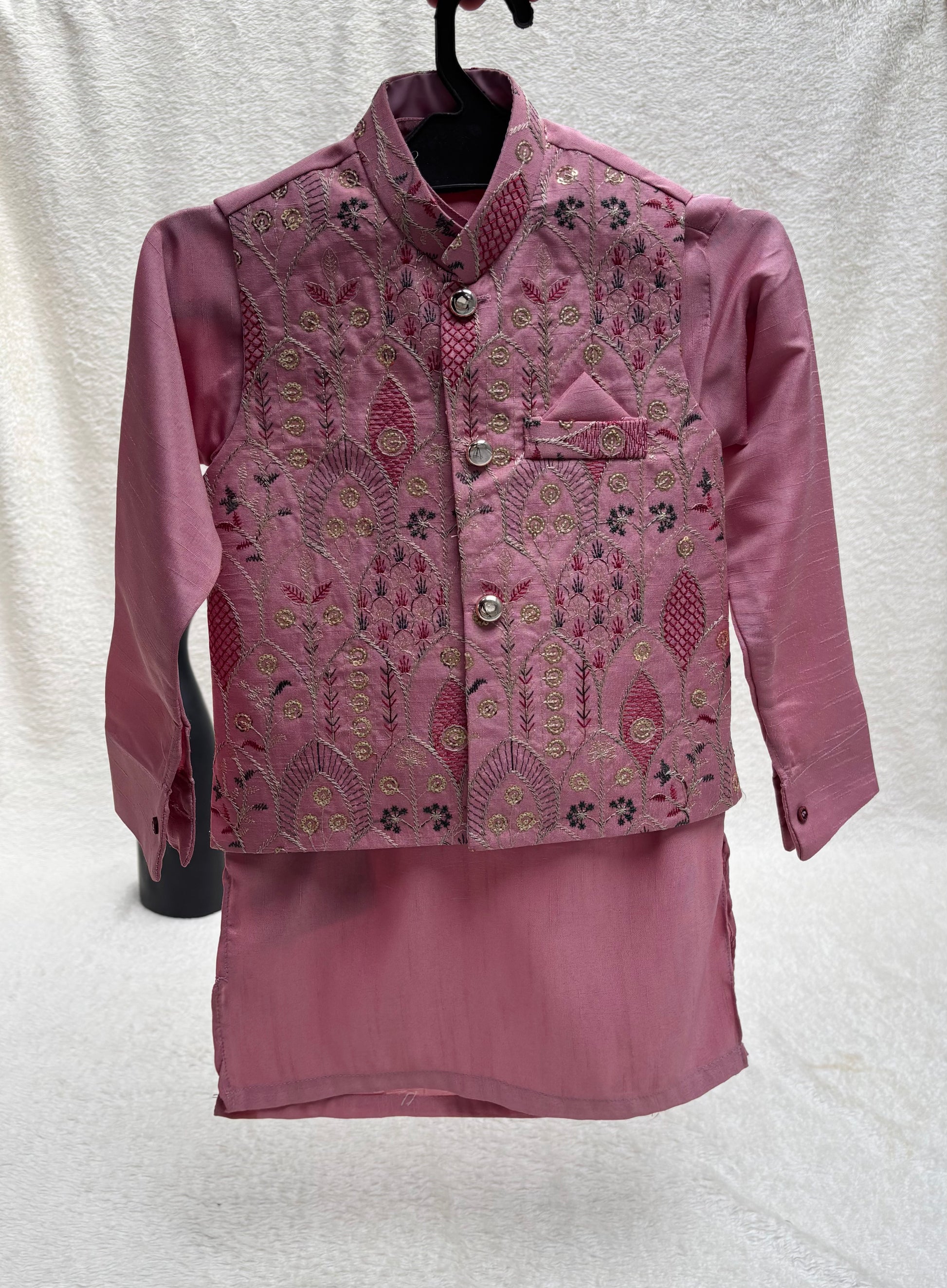 Orchid Pink Embroidered waistcoat paired with matching soft rawsilk kurta pajama. Perfect for all festive and special occasions by Eastern Buds.