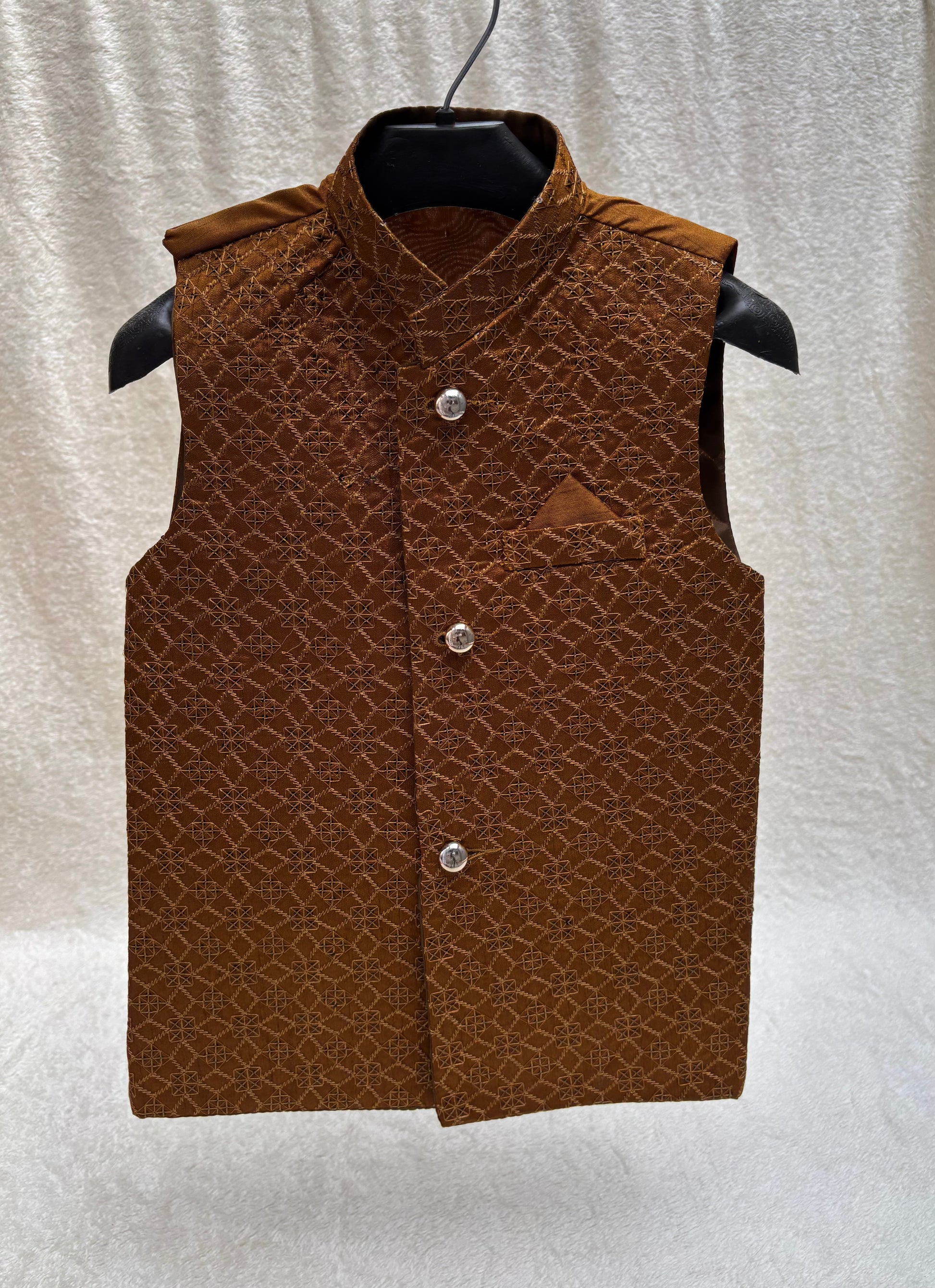 Rust Embroidered waistcoat for your little one by Eastern Buds, crafted for a regal ethnic look! Perfectly pairs with a kurta pajama, making it ideal for weddings, festives, and special occasions.