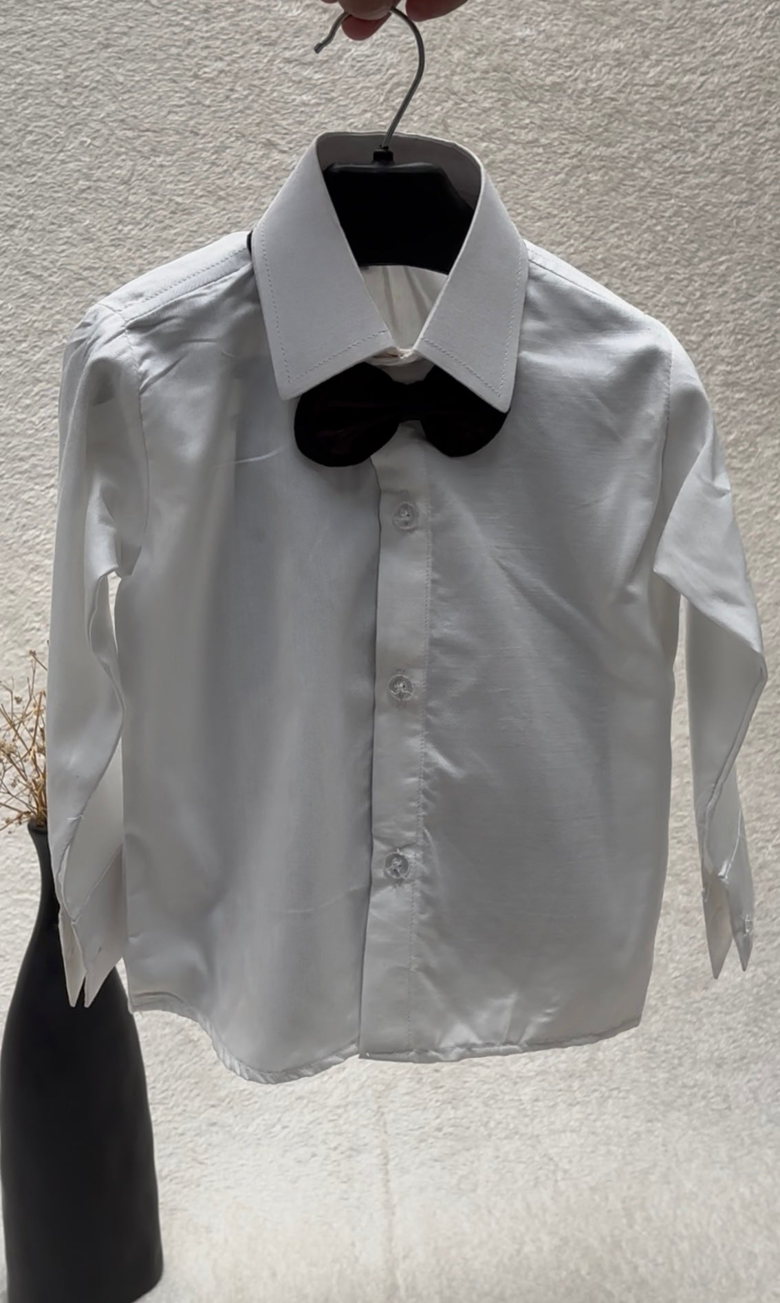 Dress your little gentleman in this stylish 4-piece suit set, featuring a Self Textured Maroon coat, black pants, a crisp white shirt, and a sleek waistcoat. The included bow tie completes the dapper look, perfect for special occasions.