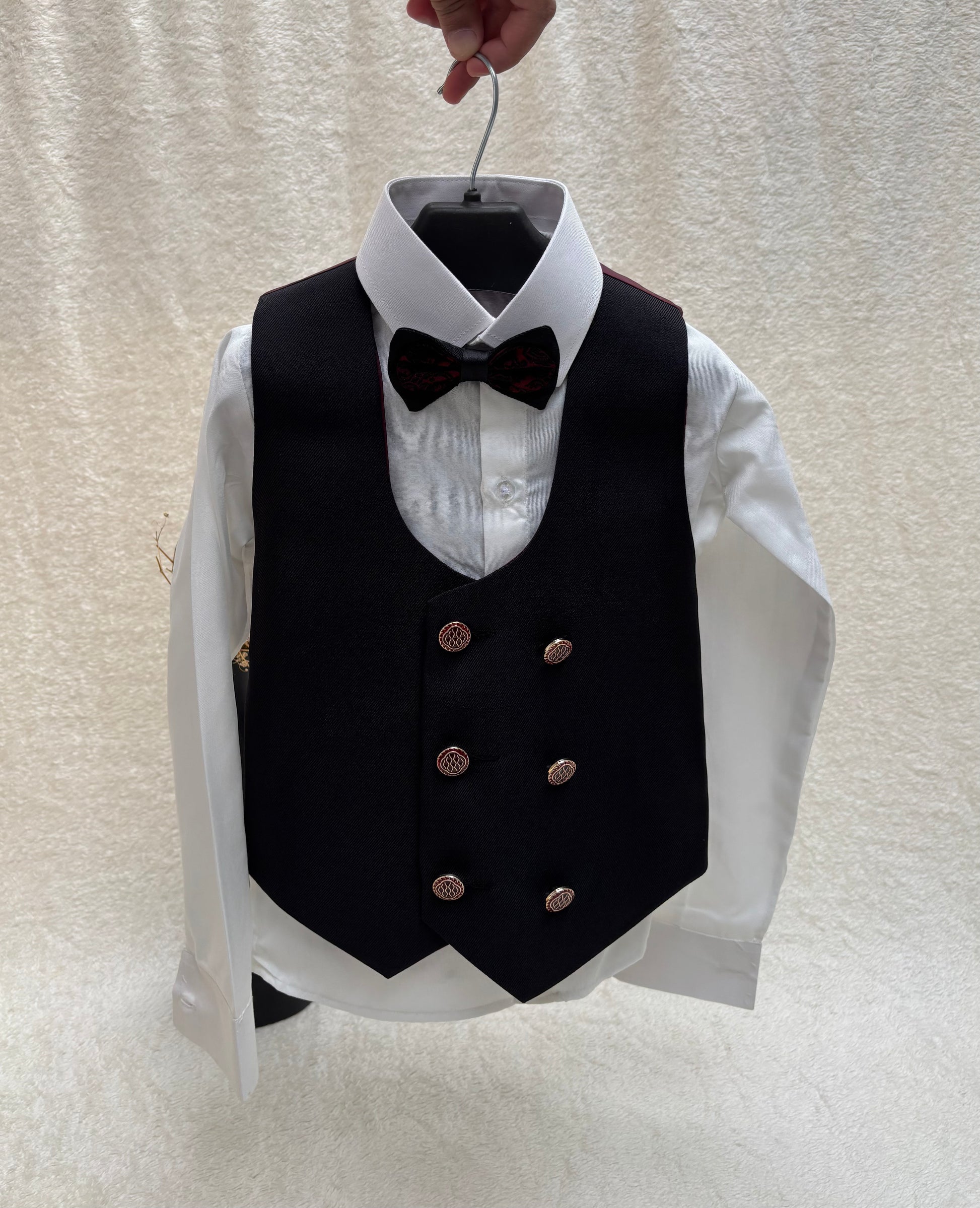 Dress your little gentleman in this stylish 4-piece suit set, featuring a Textured Maroon coat, matching pants, a crisp white shirt, and a sleek waistcoat. The included bow tie completes the dapper look, perfect for special occasions.